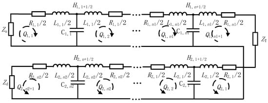 Apart from the time domain differential equations for numerical simulation [19,20,21,22,23,24,25], the ECM can also be used to investigate the complex frequency-related features of the hydraulic system, such as the transfer matrix and the hydraulic impedance. The transfer matrix is often used to calculate the forced oscillation responses of the system, while the hydraulic impedance is more suitable for free oscillation analysis. In this study, we focus on the free oscillation analysis. If a pipe is modeled by n T-shape equivalent circuit segments, the equivalent impedance is calculated recursively from one end of the pipe according to the circuit theory. The equivalent impedance of the ith loop can be obtained with Equation (4),