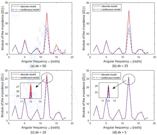 The modeling accuracy of the discrete system models is sensitive to the choice of spatial discretization. Compared with the frequency-related analytical solutions obtained from the continuous model, the discrete impedance model tends to have more precise responses for lower frequency regions. The modeling performances for higher-order oscillations are more prone to deteriorate if dx is not small enough, as shown in Figure 5. In addition, the modeling precision for higher frequency oscillations increases when the value of the spatial step further decreases.