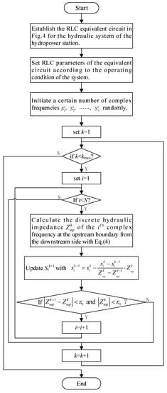 From Figure 5, the impedance at the upstream reservoir also can be obtained by calculating the total impedance of the series and parallel circuits using Equation (4) from the downstream side to the upstream side according to the circuit theory. Since the upstream and downstream reservoirs are considered to be two open ends, the impedances of the two reservoir boundaries are . The system stability is highly related to the oscillation characteristics of the hydraulic circuit in the power station. The oscillation patterns of different orders of the hydropower system are obtained by searching for the complex frequencies that satisfy the boundary condition via the free oscillation response analysis. The real and imaginary parts of each complex frequency represent the decay coefficient and the angular frequency of the oscillation of the corresponding order, respectively.
