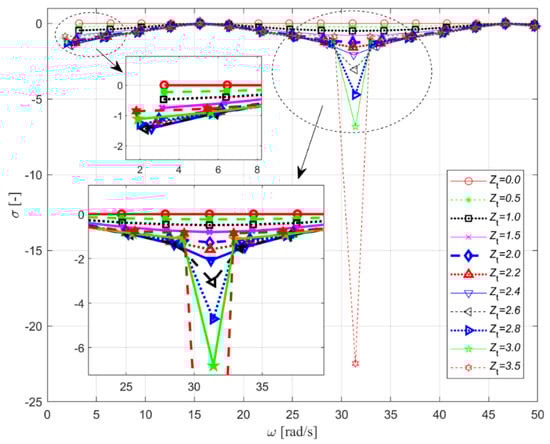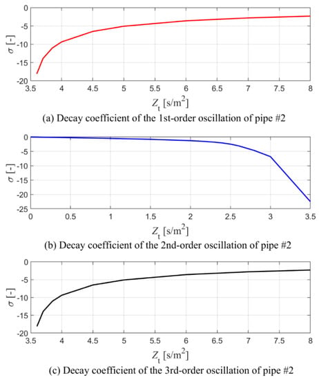 Figure 8 shows that all the decay coefficients gradually increase to zero when the angular frequency is less than 15 rad/s, which is the same trend compared to that in Figure 7. At the 6th-order oscillation (about 15.70 rad/s), the decay coefficient suddenly decreases sharply to the nadir (which is much smaller than the value of neighboring orders) and then rapidly surges to a normal value (about σ = −0.28) at the 7th-order oscillation. The decay coefficient at the 6th-order oscillation ranges from −18.11 to −2.32 when ZT decreases from 8 to 3.6. While the angular frequency is within 16 rad/s to 33 rad/s, the decay coefficient at first decreases gradually as the angular frequency increases. The decay coefficient reaches the nadir at the 11th-order oscillation (about 32.88 rad/s). Then, the decay coefficient gradually increases and reaches another crest at the 15th order of oscillation (about 46.72 rad/s), where its value is negative and close to zero. Afterward, the decay coefficient suddenly decreases sharply to the unusual nadir again at the 16th-order oscillation (about 47.11 rad/s) and rapidly rises to the normal crest (within the range of [−0.26, −0.21]) at the 17th-order oscillation (about 49.85 rad/s). From Figure 8, we can also observe the angular frequencies of the two unusual oscillations (the 6th-order and the 16th-order) are 15.70 rad/s and 47.11 rad/s, respectively. Their values are close to the 1st-order (15.71 rad/s) and 3rd-order (47.12) natural frequencies of pipe #2, respectively.