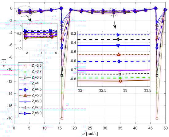Different from that of the hydraulic turbine operating conditions with smaller values of ZT (ZT ≤ 3.5), the variation curve of the decay coefficient of the system frequency responses under the hydraulic turbine operating conditions with larger values of ZT (ZT ≥ 3.6) is illustrated in Figure 8.