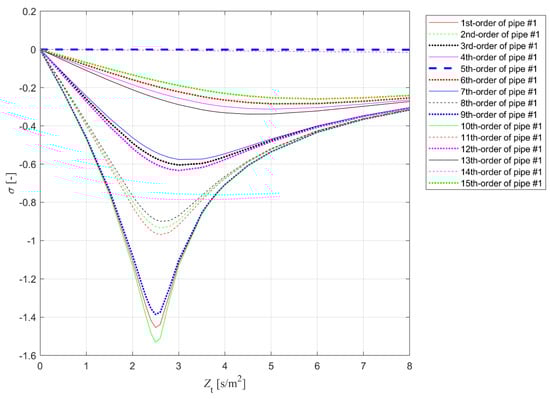 Apart from the three oscillations related to pipe #2, all other oscillations are considered related to pipe #1. The decay coefficients corresponding to different orders of oscillation related to pipe #1 under the different conditions of ZT are depicted in Figure 9. As seen in Figure 9, the decay coefficients of the 5th-order oscillation and the 14th-order oscillation are kept close to zero for all values of ZT. The angular frequencies of the two orders are 15.58 rad/s and 46.73 rad/s, respectively. These two frequencies are close to the 1st-order and 3rd-order oscillations of pipe #2. The 4th-order, 6th-order, 13th-order, and 15th-order oscillations of pipe #1 have relatively weak damping capability because the absolute values of their decay coefficients for all ZT are relatively small. The reason why they have slow convergence characteristics is that the 4th-order and the 6th-order oscillations are next to the 5th-order oscillation, and the 13th-order and 15th-order oscillations are next to the 14th-order oscillation. On the contrary, the 1st-order, 9th-order, and 10th-order oscillations have a relatively strong damping capability because the absolute values of their decay coefficients for all ZT are relatively large. The reason why they have fast convergence characteristics is that the angular frequencies of the 9th-order oscillation and the 10th-order oscillation are next to the 2nd-order oscillation of pipe #2, and the 1st-order oscillation is next to the 0th-order oscillation (i.e., the DC component).