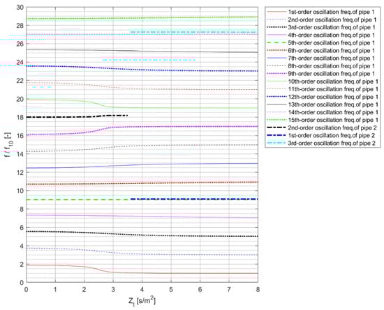 In Section 4.1 and Section 4.2, the decay coefficients corresponding to different orders of oscillation are investigated. In this subsection, we reveal the variation trend of the oscillation frequencies of the system. From Figure 7 and Figure 8, the oscillation modes of the hydropower system are separated into two parts, i.e., the oscillations related to pipe #1 and the oscillations related to pipe #2. As discussed in Section 4.1, the oscillation frequencies’ distribution of the hydropower station system tends to present odd harmonics performance when ZT is relatively large and even harmonics performance when ZT is relatively small. The critical turbine impedance of the two oscillation patterns is within the range of [3.5, 3.6]. Therefore, the variation trends of the frequencies of different orders of oscillation of the system with different ZT are illustrated in Figure 11.