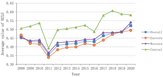 - In 2016, ECLU was a high–high agglomeration area that was still dominated by the spatial pattern of “single-core agglomeration”, which was roughly similar to the agglomeration pattern in 2012. The spatial pattern of the low ECLU agglomeration area still maintains “single core agglomeration”, but the distribution range extends from the central and southern parts of the Western mountain area to the southwest–northeast direction, and the coverage increases to 10 cities.