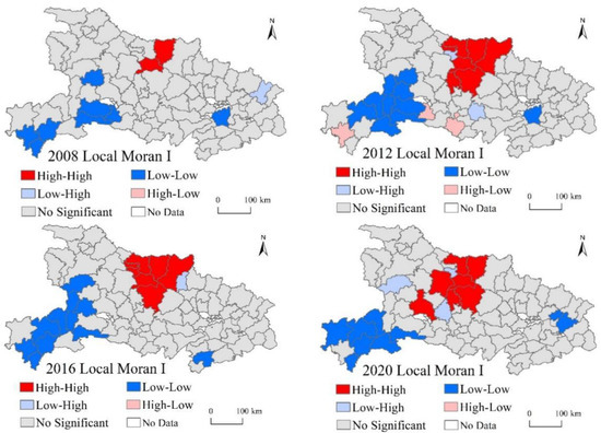 - In 2012, ECLU was a high–high agglomeration area that mainly showed the trend of “single core expansion”. The core continued to radiate outwards on the basis of the agglomeration pattern in 2008, mainly covering seven cities, including the central and eastern part of Xiangyang, most of Suizhou, and the central and western parts of Jingmen. ECLU was a low–low agglomeration area that mainly presents a spatial pattern of “single-core agglomeration”. The core is mainly based on the clustering pattern in 2008, which is composed of three single cores that converge into one single core, covering nine cities, including Enshi, where they are still distributed in the central and southern mountainous areas of Western.