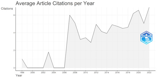 As more and more research has been conducted over time, the citations of the articles has increased. In the beginning, there were few articles, and there was a decline in the literature. In 1998, there was only one citation, and no citations were available from 1999 to 2002. In 2003, a total of 1.8 citations per year were available. For the next three years, there was not a single citation available; however, in 2007, we can see exponential growth in the number of citations, as shown in Figure 2. Until 2021, we can see that there has been a diverse range of citations each year, increasing in some years and decreasing in others. However, we can see a considerable rise in citations during the calendar year 2022.