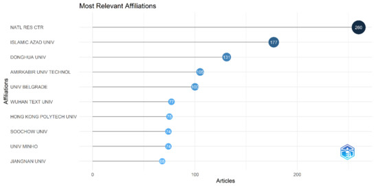 We performed an analysis to identify the most relevant sources. We found that the National Research Center, Egypt (NATL RES CTR), is at the top, with a total of 260 documents. The Islamic Azad University, Iran (ISLAMIC AZAD UNIV), is second, with a total of 177 documents; the third was Donghua University, China (DONGHUA UNIV), with a total of 131 documents (Figure 3).