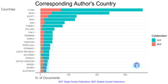 Similarly, the corresponding authors’ countries were evaluated. As shown in Figure 4, China is the leading country regarding the corresponding authors, with a total of 144 multiple-country publication (MCP) documents and 578 single-country publication (SCP) documents, followed by India, with an MCP of 78 documents and an SCP of 409 documents.