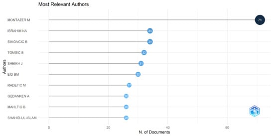 The data were evaluated to identify the most relevant authors. Montazer M., with 71 documents, is the leading author, followed by Ibrahim N. A. and Simoncic B., with 34 documents (Figure 5). We also analyzed the data to determine the authors’ production over time. The leading author, Montazer M., published two articles in 2007, one article in 2009, two articles during the calendar year 2010, five articles in 2011, four articles in 2012, seven articles in 2013, five articles each in 2014 and 2015, seven articles in 2016, nine articles in 2017, eight articles in 2018, six articles in 2019, two articles in 2020, six articles in 2021, and only one article in 2022. The highest number of articles he published in a calendar year is nine. Similarly, the authors’ impact was evaluated. Montazer M., with a total of 3294 citations, is the leading author, followed by Mohammad F., with 1663 citations (Figure 6).