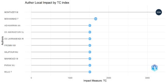 We found that “Antibacterial properties of nanoparticles”, a review article by Hajipour M. J. et al., 2012, is the most cited document in this field, published in the journal Trends in Biotechnology [49]. This article is a review of the literature about antimicrobial activity in multiple fields. The authors also mention the importance of nanoparticles in antimicrobial activities. So far, this article has been cited in 1511 documents (Table 3).
