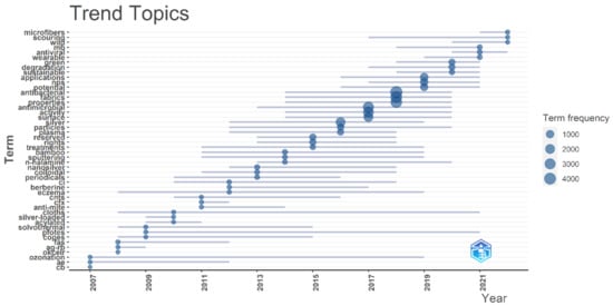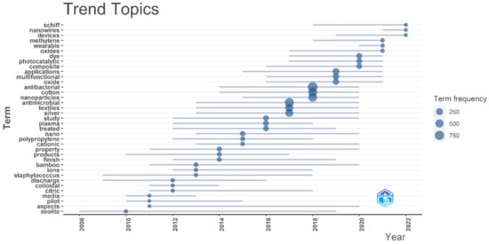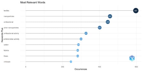 The most frequent words used in the literature from 1998 to date were “textiles”, which led with a total count of 597, followed by “nanoparticles”, with a total count of 457, and “antibacterial”, with a total count of 445 (Figure 7).