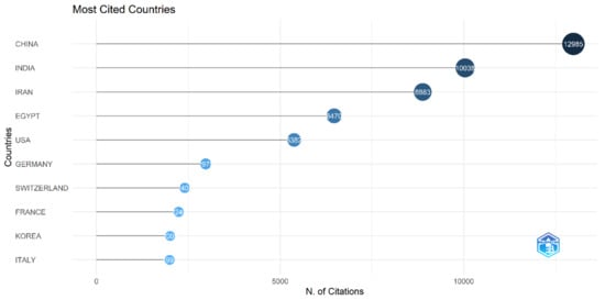 We analyzed the data to identify the leading countries that have produced the most publications. We found that China was at the top, with a total of 12,985 citations having 1678 scientific productions, followed by India, with a total of 10,038 citations and 1080 scientific productions. Iran stands in the third position with a total of 8883 citations and 544 documents, as shown in Figure 9 and Table 2.