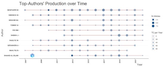 We found that Montazer M. is the most relevant author, with a total of 71 documents, followed by Simoncic B. and Ibrahim N. A., with a total of 34 documents for each author (Figure 10). Similarly, we analyzed the data to identify the authors’ production over time. We found that Montazer M. published two articles in 2007 and received 10.94 citations. A significant boost was seen in his production in 2017, when he published nine articles in a calendar year (Figure 11).