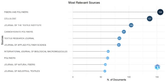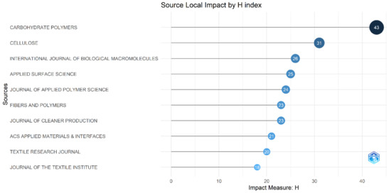 The most relevant sources were Fibers and Polymers, with a total of 156 documents, followed by Cellulose with a total of 137 documents and The Journal of The Textile Institute with a total of 104 documents, as shown in Figure 12. Similarly, the source of local impact was found. Carbohydrate Polymers, with an H-index of 43, is the most impactful source, followed by Applied Surface Science, as provided in Figure 13.
