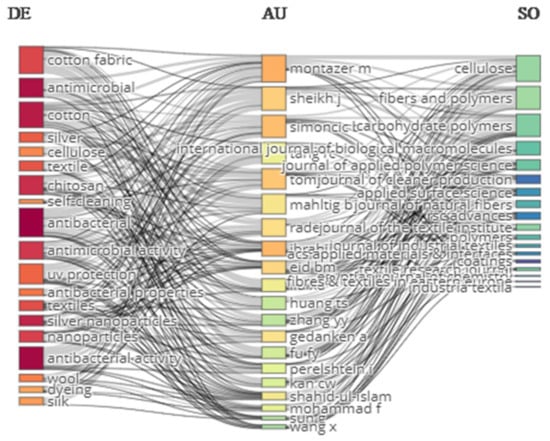We identified the links between the authors, keywords, and sources. The most impactful author was Montazer M., and the most impactful source was Cellulose. The most frequent keyword was “cotton”, followed by “antimicrobial”, as shown in Figure 14.