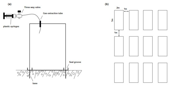 After six years of treatment, greenhouse gases were collected in early August, the peak of the 2020 growth season. Sampling was conducted on three consecutive sunny days, from 9 am to 11 am. An opaque PVC static box with a diameter of 20 cm and a height of 25 cm was used for sampling (Figure 1); the box was placed on a base (the base was made of PVC and had been inserted 5 cm deep into the soil) and sealed with distilled water. The gas inside the chamber was collected with the use of 50 mL plastic syringes 0, 5, 10, 15, 20, and 25 min after closing the static chamber [27]. The collected gas samples were sealed in foil sampling bags and then transported to the laboratory within 24 h; the samples were analyzed using a gas chromatograph (Agilent-7890B, Agilent Technologies, Inc. Santa Clara, CA, USA).