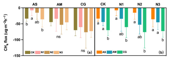 (a) The impact of N deposition levels on CH4 fluxes; (b) The impact of grassland type on CH4 fluxes. Different letters indicate a significant difference between different grassland types at p < 0.05. AM: alpine meadow; AS: alpine steppe; CG: cultivated grassland; CK: no N deposition; N1: N addition at 8 kg Nha−1yr−1; N2: N addition at 24 kg Nha−1yr−1; N3: N addition at 40 kg Nha−1yr−1.