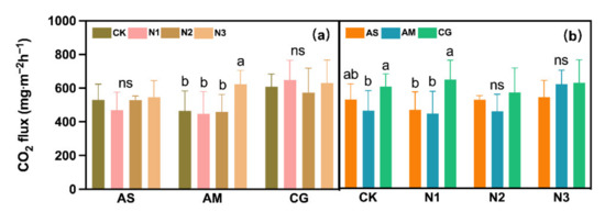 (a) The impact of N deposition level on CO2 fluxes. (b) The impact grassland type on CO2 fluxes. Different letters indicate significant differences between different grassland types at p < 0.05. AM: alpine meadow; AS: alpine steppe; CG: cultivated grassland; CK: no N deposition; N1: N addition at 8 kg Nha−1yr−1; N2: N addition at 24 kg Nha−1yr−1; N3: N addition at 40 kg Nha−1yr−1.
