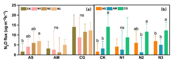 (a) The impact of N deposition level on N2O fluxes. (b) The impact of grassland type on N2O fluxes. Different letters indicate significant differences between different grassland types at p < 0.05. AM: alpine meadow; AS: alpine steppe; CG: cultivated grassland; CK: no N deposition; N1: N addition at 8 kg Nha−1yr−1; N2: N addition at 24 kg Nha−1yr−1; N3: N addition at 40 kg Nha−1yr−1.