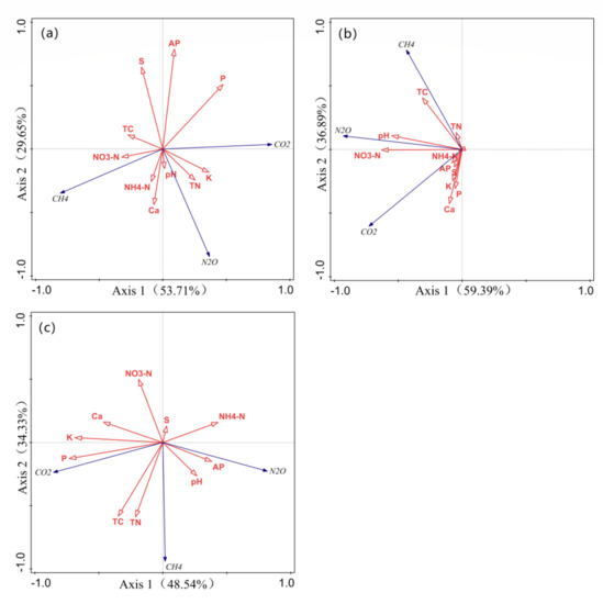 RDA (redundancy analysis) between GHG fluxes and soil factors in different types of grasslands. (a) Alpine steppe (AS); (b) Alpine meadow (AM); (c) Cultivated grassland (CG). Soil factors: TN (total nitrogen); TC (total carbon); NH4+-N (ammonium nitrogen); NO3−-N (nitrate nitrogen); AP (available phosphorus); Ca (Calcium); K (potassium); P (Phosphorus); S (Sulfur).
