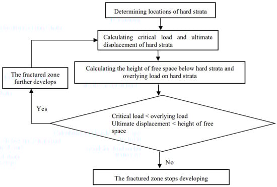 The development process of a fractured zone in overburden during backfill mining is mainly controlled by whether the hard strata are fractured or not, which is influenced by the critical load, ultimate displacement, and subsidence. At the position of the working face, if the ultimate displacement is smaller than the height of free space and the ultimate load is lower than the load borne by the hard stratum, then the hard stratum is fractured. Likewise, whether the upper hard stratum is fractured or not is analyzed in a same way until reaching a hard stratum that is not fractured, then the fractured zone stops growing further upwards. The concrete analysis flowchart is shown in Figure 3 [,]. The mining thickness determines the free space height below the critical layer, and the free space height determines whether the key layer will fracture or not. As the mining thickness increases, the free space height below the key layer increases. When the accumulation of the free space height reaches the ultimate displacement, it will fracture, and then the fracture zone will suddenly develop upward. Accordingly, it is concluded that the fracture zone develops upward layer by layer with the increase of mining thickness.