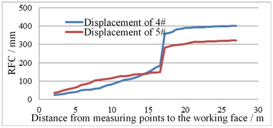 After installing the dynamic alarm apparatuses for RFC, the displacement and stress changes of the roof and floor were recorded in real time. Due to geological conditions during construction and the quality of the apparatuses, only apparatuses at measuring points 4#, 5#, 6#, 7#, and 12# worked normally. There was an enormous amount of data because these apparatuses recorded data twice an hour, and the stress remained basically unchanged in a period of time, which were unconducive to analysis. To more intuitively analyze the relationship between the RFC and the distance from the working face, the monitoring data were retrieved every time that the working face was advanced forward.