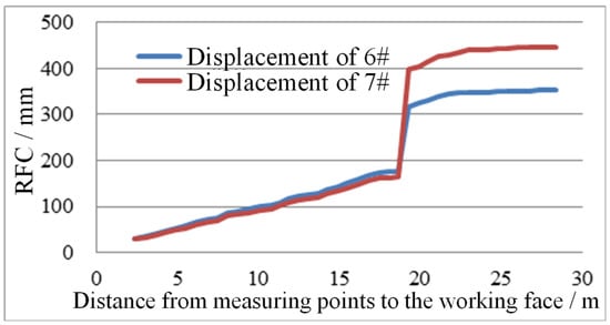 Relationship curves for the distances from measuring points to the working face and the RFC were drawn by taking the distances from measuring points 6# and 7# to the working face as the independent variable and the RFC as the dependent variable (Figure 6). It can be seen from the figure that the RFC grows in a leaping manner when the distances from the measuring points to the working face are 19.3 m, which is caused by the large areas of fracture of overburden of the goaf. The RFC tends to stabilize after the distances from measuring points to the working face increase to 23 m.