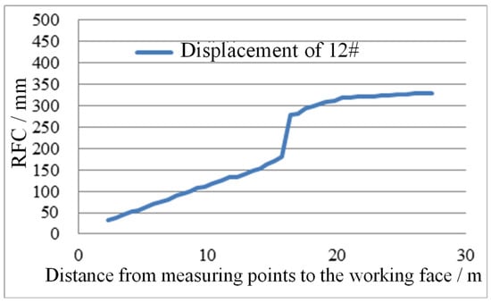 The relationship curve for the distance from a measuring point to the working face and the RFC was drawn by taking the distance from measuring point 12# to the working face as the independent variable and the RFC as the dependent variable (Figure 7). As displayed in the figure, the RFC increases in a leaping manner when the distance from the measuring point to the working face is 16.4 m, which is caused by large areas of fracture of overburden of the goaf. When the distance from the measuring point to the working face lengthens to 21 m, the RFC becomes stable.