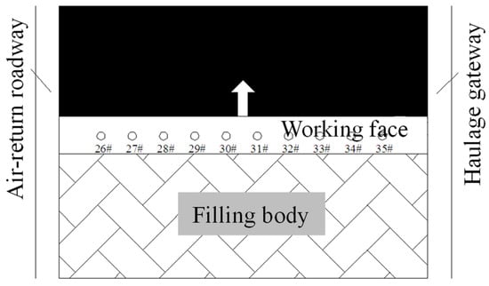 The overburden deformation and failure characteristics during backfill mining were measured and analyzed in the field by taking the 1327 working face of Xima Coal Mine (Shenyang City, Liaoning Province, China) as an example. The 1327 working face is located in the No. 1 south mining field at the level of −350 m in order to mine the 13# coal seam to the inner side of the protective coal pillar. The average elevation of the ground is +18.5 m; the elevation and average burial depth of the coal seam in the working face are −397 m~−497 m and 447 m, respectively. The working face is 137.4 m long on average with an inclined advance length of 501.9 m and an area of 70,255 m2. The thickness of the coal seam is in the range of 1.4~2.2 m and the average mining thickness is 1.811 m, with the filling rate of 81%, average filling height of 1.465 m, and equivalent mining height of 0.399 m. The working face is advanced at a rate of 3 m/d on average. The recoverable reserve of the working face, extraction rate, and production capacity of the coal seam are 9.27 × 104 tons, 97%, and 1.36 t/m2, respectively. The working face is a monoclinal structure with a dip angle of 3°.