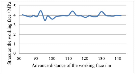 The stress on the working face was recorded every time that the working face was advanced forward. An analysis of the monitoring results of the whole working face revealed that the monitored stress at the ten monitoring points is distributed in the range of 3.5~4.5 MPa. By integrating and analyzing the data obtained at these ten points, the relationship curve for advance distance of the working face and average stress on the working face was drawn, as shown in Figure 9.