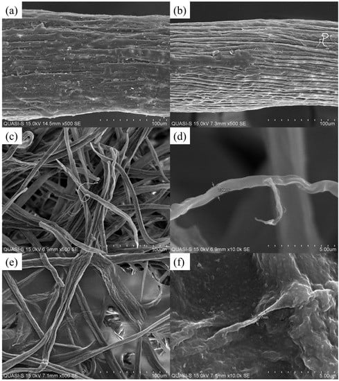 SEM images of (a) raw OPEFB fiber; (b) bleached OPEFB fiber; (c,d) isolated cellulose (35 °C, 15 min and 54%); (e,f) isolated cellulose (35 °C, 15 min and 60%).