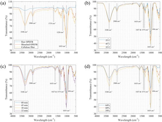 FTIR spectra of (a) raw OPEFB, bleached OPEFB and cellulose fibers; (b) cellulose fibers at different hydrolysis temperatures; (c) cellulose fibers at different hydrolysis times; and (d) cellulose fibers at different acid concentrations.