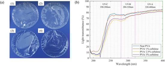(a) Physical appearance of (1) neat PVA; (2) PVA/1% cellulose; (3) PVA/2.5% cellulose; and (4) PVA/5% cellulose. (b) UV-vis spectra analysis of neat PVA and biocomposite films in the UV wavelength range.