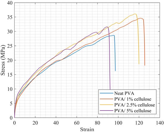 Stress-strain plot of neat PVA and biocomposite films at different cellulose loadings.