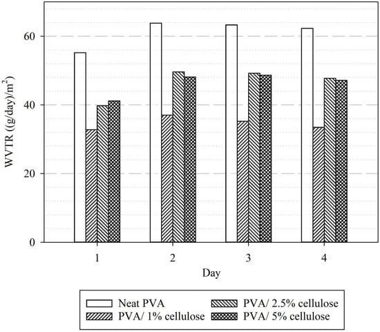 Water vapor transmission rate (WVTR) of neat PVA and biocomposite films at different cellulose loadings.