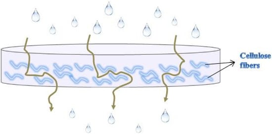 Cellulose fiber-reinforced biocomposites have attracted significant attention due to their appealing properties such as low density, non-toxic, low cost, non-abrasive and low resistance to biodegradability []. There are many applications of cellulose fibers in this context. To name a few, cellulose fibers can be oxidized for the preparation of poly(methyl methacrylate) (PMMA) nanocomposites [], poly(2-acrylamido-2-methylpropanesulfonic acid/poly(acrylic acid (PAMPS/PAA) hydrogels [], polygluronic acid [] and bioadsorbent for paraquat []. In addition, various works have proven that adding cellulose fibers into PVA could provide a significant reinforcing effect to tackle the poor mechanical properties of the PVA film [,,,]. Cellulose can be extracted from agricultural wastes such as rice husk, corn stover, palm oil bunches, etc. [,,]. In Malaysia, about 3.31 million hectares of land are under oil palm cultivation [], and the amount of biomass wastes generated is an average of 231.5 kg dry weight/year []. Oil palm biomass wastes consist of the oil palm empty fruit bunches (OPEFB), oil palm trunk (OPT) and oil palm fronds (OPF). These wastes are of low commercial value and are usually landfilled. Therefore, incorporating cellulose fibers from agricultural waste into the PVA matrix to form cellulose fibers-reinforced PVA biocomposite film as water-soluble detergent capsules could promote sustainability.