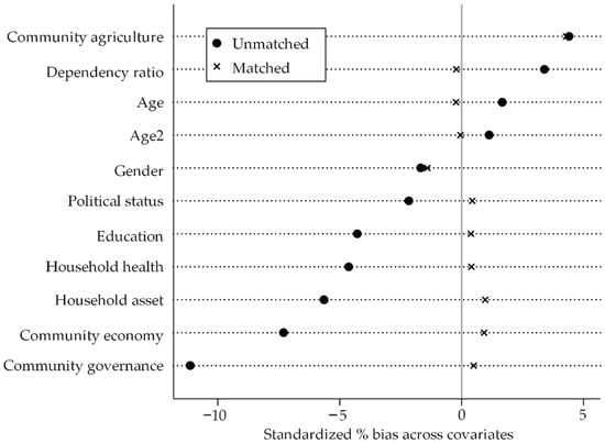 As the sample size tracked from 2011 to 2019 is too sparse, it is difficult to conduct an acceptable parallel trend test in this study. DID matching estimators are an extension of traditional regression approaches and of the combination of the DID model with the propensity score matching and are helpful to avoid parametric assumptions about the relationship between the dependent variables and the covariates (i.e., ) [,,,,,,,]. Therefore, this paper applies the DID matching estimators to make it easier for individuals in the treatment and control groups to have the same time-trend under the given covariates. Then, we designate land certification as the processing variable. and agricultural entrepreneurship as the outcome variable. In this part of the matching process, this study applies logistic regression to calculate the propensity score, based on the nearest-neighbor matching estimator, weighting the control group according to their similarity to the treatment group, where similarity is based on .