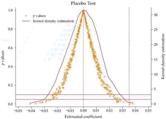 In order to run a further test as to whether the above results are driven by unobservable factors at the community-household-year level, the authors conducted a placebo test by randomly assigning treated households []. In detail, the new treatment group is randomly selected by maintaining the same sample size as the old one from a full sample. Then, the authors carried out this random sampling 500 times and finally conducted baseline regression according to Equation (3), individually. Figure 2 displays the distribution of estimated coefficients and the related p-values of 500 regressions, demonstrating that the estimated coefficients of land certification are concentrated around 0. The real estimated coefficient in this paper (from column (4) of Table 2) is an obvious outlier in the placebo test. Meanwhile, the p-values of most of the estimated values are greater than 0.1. These results imply that the estimation results of this paper are unlikely to be driven by unobservable factors at the community-household-year level.