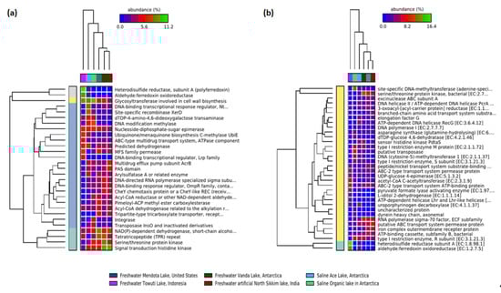 - Ahmad, T.; Gupta, G.; Sharma, A.; Kaur, B.; El-Sheikh, M.A.; Alyemeni, M.N. Metagenomic analysis exploring taxonomic and functional diversity of bacterial communities of a Himalayan urban fresh water lake. PLoS ONE 2021, 16, e0248116. [Google Scholar] [CrossRef] [PubMed]