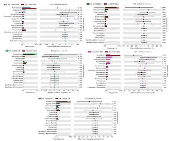- Parks, D.H.; Tyson, G.W.; Hugenholtz, P.; Beiko, R.G. STAMP: Statistical analysis of taxonomic and functional profiles. Bioinformatics 2014, 30, 3123–3124. [Google Scholar] [CrossRef]