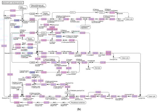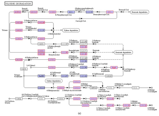The other abundance pathways include Benzoate, Toluene, Benzene, and Xylene degradation pathways. Benzene, Toluene, and Xylene are classified as BETEX hydrocarbons, which constitute a single aromatic ring among other volatile organic compounds (VOCs) [40]. They are considered to be highly toxic and carcinogenic, and the predominance of their degradation pathways at the sampling site could exert a controlling effect on these harmful VOCs. The increased hydrocarbon-degrading enzymes in the sampling site could be due to the anthropogenic environmental pressure caused by land sliding [41]. The land-slide event possibly led to the degradation of plant-litter decomposition, resulting in the generation of VOCs [42]. In addition, being a tourist place, the human activities at the sampling site could lead to the accumulation of hydrocarbons. Thus, the microbial processes for the degradation of these hydrocarbons lead to an increase in hydrocarbon degrading enzymes in this region. These results are well related to East Taihu Lake (China), which showed an increase in hydrocarbon-degrading microbes due to disturbances caused by anthropogenic activities at the site [43]. This comprehensive metagenomic examination deciphered the genes involved in the degradation route of the hydrocarbons (Figure 4; Table S5).