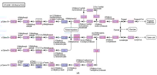 The metagenomic genes mapped to hydrocarbon degradation pathways (a) Methane degradation; (b) Benzoate degradation; (c) Toluene degradation; (d) Xylene degradation; (e) ethylbenzene degradation. The supportive details are given in Table S5.