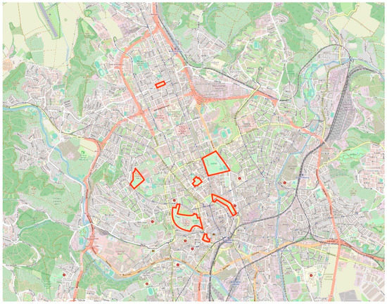 In the next step, we randomly selected streets within 2 km from the selected parks and distributed an invitation to each of the residents in the area. The residents were encouraged to indicate their interest in focus group participation by contacting the research team; they were offered a small incentive. Based on the respondents’ interests, we composed six sub-groups reflecting the diversity of the participants in gender, age, education, and social status. All chosen streets are marked in Figure 2.