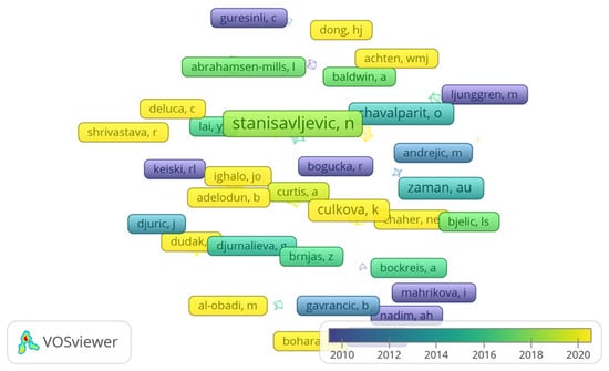 The present research is based on a Web of Science (WoS) search scanning the published literature (both articles and review articles) on the topics of waste treatment, waste management, the Green Deal, and sustainable consumption, in all fields and all WoS categories from 2010–2022. The search returned 166 articles, from which only 58 were selected based on the relevance criteria, the results obtained, and the environmental impact. Both groups of papers that included similar results between each other but were published before 2018, and those without full-text access that were very theoretical or irrelevant to the study, were removed. Figure 1 shows the results of the authors grouped by main topic and year, together with the connection between them.