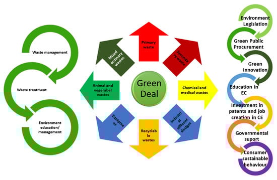 Since waste treatment is a very expensive process [8], the main principle of prevention, which is easier than treatment, should be implemented at the EU level. It is better and more cost-effective to adopt eco-friendly approaches to meet the Green Deal’s objectives of reducing and reusing waste. Companies that embrace corporate responsibility regarding eco-friendly principles are the beneficiaries of free marketing, due to their green brand. Giving a personal, positive example is the best way to convince other companies and people to adopt sustainable eco-friendly behavior; sustainability in all aspects—economic, environmental, social, and time—became the aim of any country or business [9].
