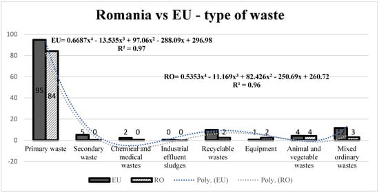 As shown in Figure 3, which gives provides the trend of types of waste produced in Romania and the EU, it was confirmed that most of the waste produced by the EU and Romania is represented by primary waste (over 84%), while the remaining 16% of waste is composed of secondary waste, chemical and medical waste, industrial effluent sludge, recyclable waste, equipment, animal and vegetal waste, and mixed ordinary waste. One may observe a visible difference between the EU and Romania regarding the primary waste, recyclable waste, and mixed ordinary waste that is produced in far larger ratios at the EU level. This situation may be explained, on the one hand, by a higher living standard in the West European states, which may be associated with an accumulation of more important quantities of primary waste and, on the other hand, by a higher level of WFD implementation, awareness, and sanction regimes in other European member states, which already develop functional and sustainable systems of waste reuse and recycling, by categories, thus contributing to more coherent protection of the environment.