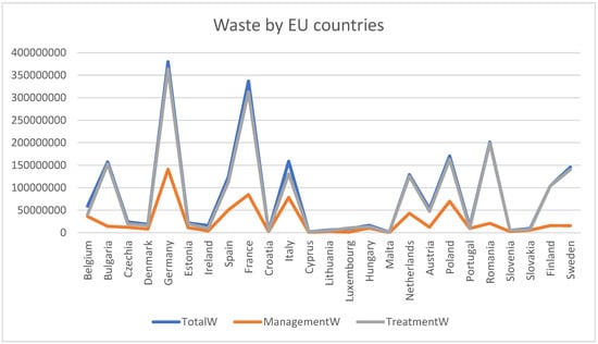 In the second phase, a cluster analysis was performed in three steps and over three criteria: wtotal, wmanag, wtreat. The variables were collected from five different charts [50,51,52] and an average was made. The results are shown in Figure 4, where it is very easy to observe that Germany and France have had the highest waste production (ca. three times more waste than other states with a high production of waste), but most of the waste was treated. These rates are explained by the dimension and population of the states, the high living standards, and the production industries. This is a typical case of developed industries, where innovation within each industry should be provided and the new policies recommended by the Green Deal should be enforced.