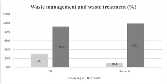 Romania is an interesting case when considering waste treatment. Figure 5 shows that Romania succeeds in treating 98.7% of its waste compared to the EU, which overall appears to be less efficient (91.8%). Nevertheless, Romania still has issues and needs to improve its waste management (EU, 29.3% and Romania, 10.4%), with governmental support.
