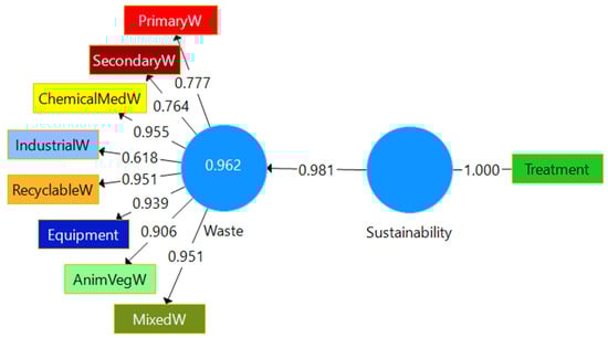 As in the previous step, the waste treatment appeared to be very high in the Sustainability variable, referring to the waste treatment that influences each type of waste was created. Among the items with higher weight in the Waste variable (Figure 6), ChemicalMedW (LF = 0.955), RecyclableW (LF = 0.951), MixedW (LF = 0.951), Equipment (LF = 0.940), and AnimVegW (LF = 0.940) need to be highlighted. Less important factors are PrimaryW (LF = 0.777), SecondaryW (LF = 0.764), and IndustrialW (LF = 0.618). Thus, one may affirm that primary, secondary, and industrial waste are the least treated categories of waste and that such waste is not very well-managed.