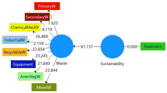 For the model, two variables have been chosen: Sustainability as the formative variable, and Waste as the reflective variable, to measure the influence of the Sustainability variable (consisting of two items, Management (Mng) and Treatment, which reflect the sustainable solutions found to mitigate the waste impact on human health and environment) on the Waste variable that reflects the management of the eight types of waste, consisting of the eight sub-items (PrimaryW, SecondaryW, ChemicalMedW, IndustrialW, RecyclableW, Equipment, AnimVegW, and MixedW), as presented in Figure 6.